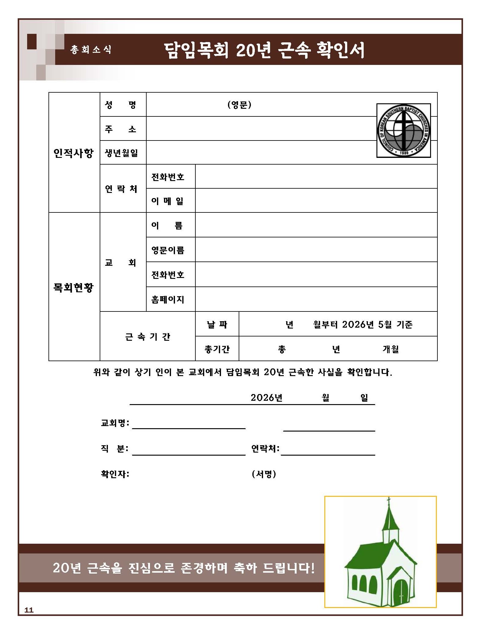 담임목회 20년 근속 확인서