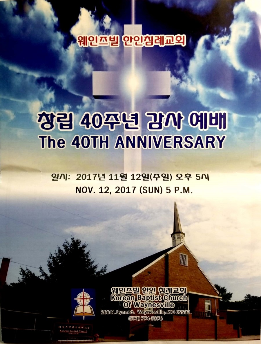 미주리의 웨인즈빌이라는 작은 도시에서 신실하게 사역해왔던 웨인즈빌 한인침례교회는 지난 11월 12일에 창립 40주년 기념 감사예배를 드렸다. 미주리 지방회의 목회자들이 함께 참석하여 축하 하는 복된 시간이었다. 정수갑 담임목사과 웨인즈빌 교회는 무엇보다 선교 사역에 힘쓰며, 지역사회에 본이 되고 있다. 총 17 가정의 선교사들을 후원하고 있으며 중남미, 아프리카, 멕시코 등에서 교회를 세우는 사역을 감당하고 있다. 또한 2년 전 총회 때 한 해 동안 해외선교부에 가장 많은 선교헌금을 드린 교회로 지정되기도 하였다. 이번 창립 40주년을 기념하여 인도에 교회를 건축해 봉헌하기로 했다. 이제 더 성숙한 교회로 귀히 쓰임 받는 교회가 되길 기도한다.