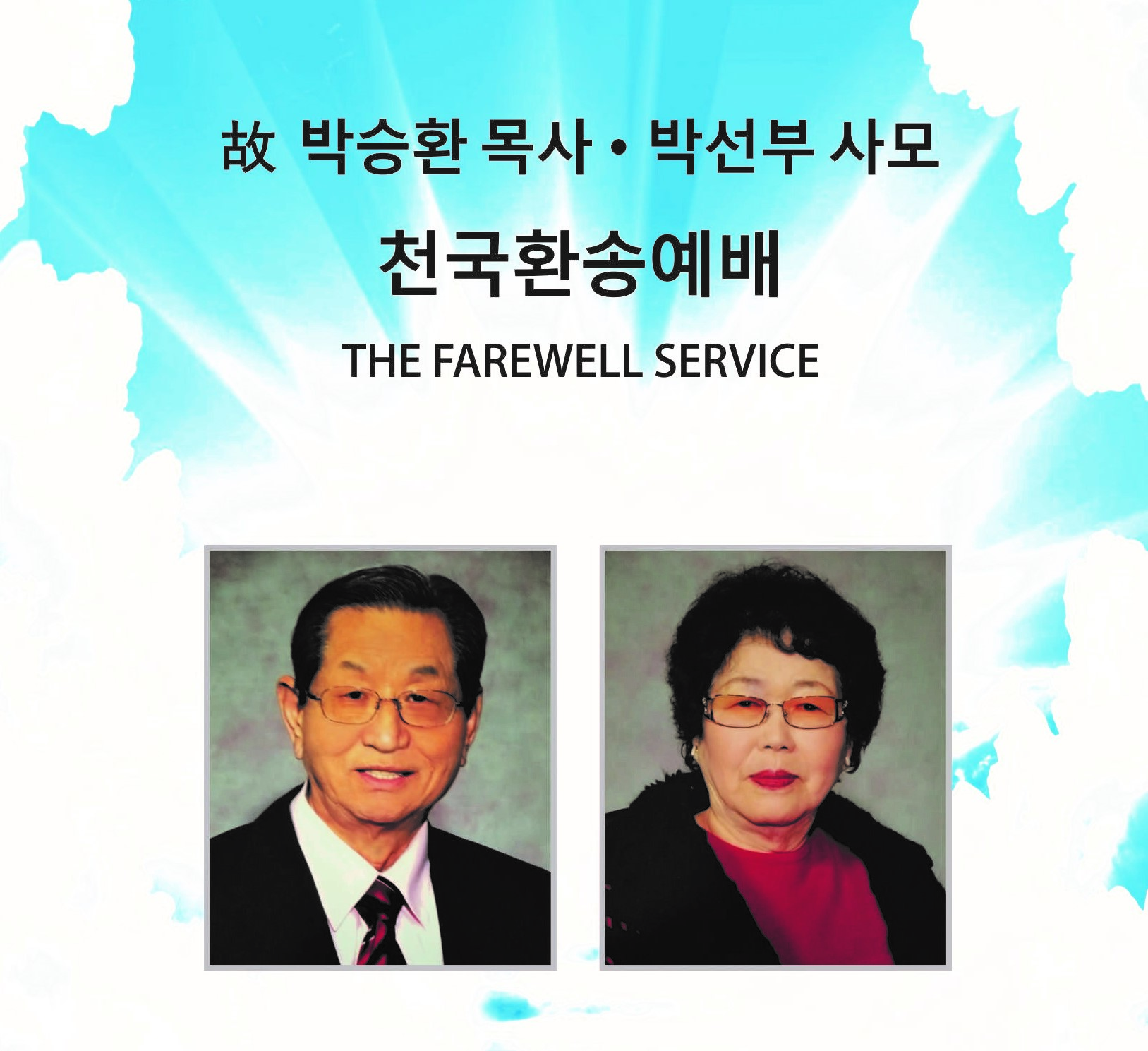 지난 5월 3일(월) 오전 9시에 고 박승환목사와 박선부사모의 합동 천국환송예배가 Rose Hill Memorial Park 야외 Chapel에서 있었다. 고 박승환목사는 지난 4월 8일 오후에 아내 박선부사모가 소천한 후 하루도 되지 않아 그 뒤를 이어 하나님의 부르심을 받으셨다. 박승환목사는 향년 92세, 박선부사모는 91세이다.