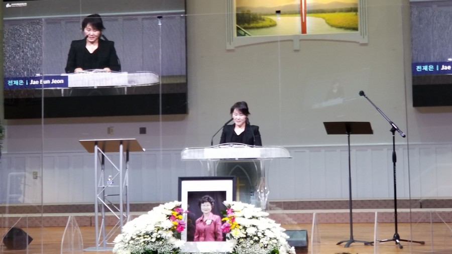 다니엘김(둘째 사위)의 조가와 세 분의 조사가 있었다. 먼저 문대연목사(아가페만나)는 지난 40여 년 동안 친구처럼 지낸 문창선목사 내외분과의 추억을 그리며 두 분이 함께 이루신 귀한 사역들에 존경을 표하며 감사하였다. 작은딸 문혜성 자매는 가정에서나 교회에서 늘 신앙의 본이 되어주시고 신앙으로 양육해 주신 어머님을 기억하며 고마움과 사랑을 표현했다. 조카 전재은 자매는 고인이 좋아하시던 시을 낭독함으로 조사를 대신하였다. 장녀 문혜영 자매는 가족 인사의 시간을 통해 영적인 가족이 되어주신 타코마제일침례교회 성도들과 함께하신 모든분들에게 거듭 감사를 표하며 인사를 대신하였다. 유용식목사(타코마 목사회 회장)의 축도로 모든 예배를 마치고 유가족과 인사하는 시간을 가졌다. 이번 천국환송예배는 미국 각 지역과 한국, 그리고 선교지에서도 온라인을 통해 고 문성주 사모를 그리며 함께하였다.