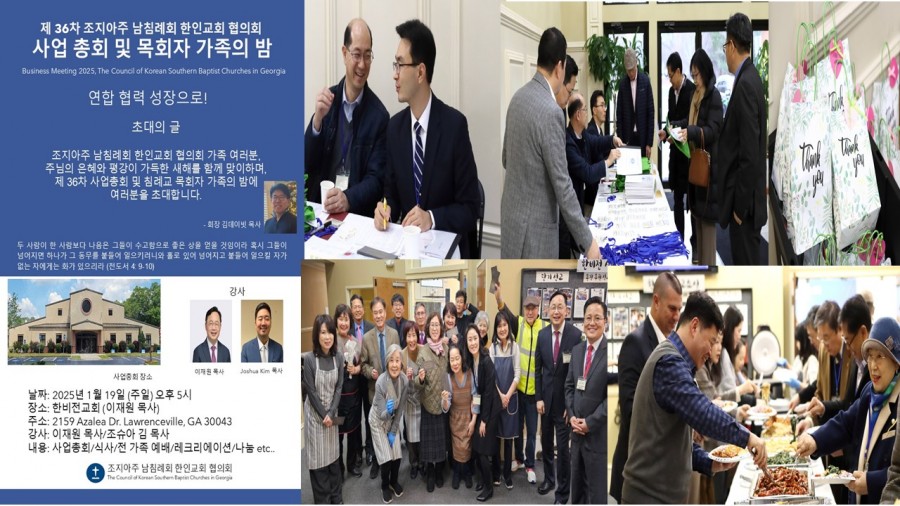 2025 1 19(주일) 오후 5, 조지아주 남침례회 한인교회 협의회(회장 김데이빗 목사/총무 최성산 목사) 36 사업총회를 한비전교회(담임목사 이재원)에서 성황리에 개최했다. 이번 총회는 "연합, 협력, 성장으로!"라는 주제로 128명의 목회자와 사모, 자녀들이 함께하며 하나님 나라 확장을 위한 새로운 비전을 공유하고 연합과 협력을 다짐하는 시간이 되었다