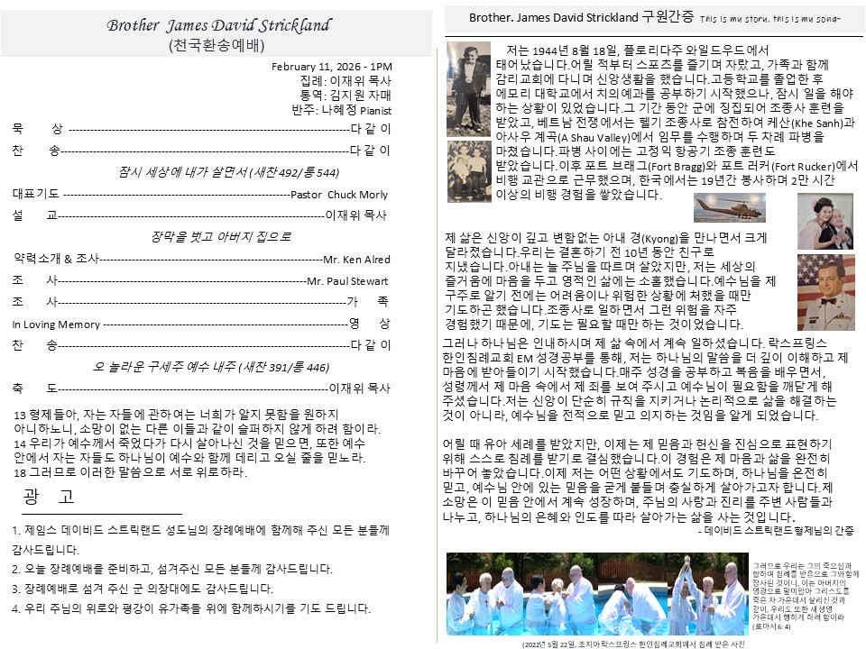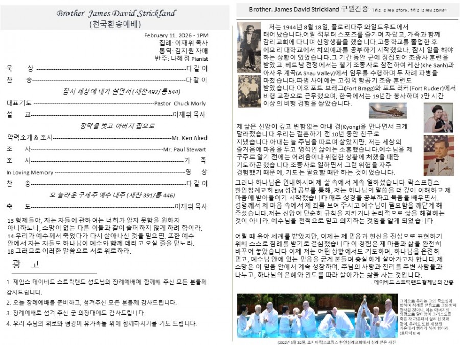 육군 베트남전 참전용사이자 브론즈스타(Bronze Star) 수훈자인 제임스 데이비드 스트릭랜드(James David Strickland, 향년 81) 성도가 2026 1 28 조지아주 샌디스프링스에서 별세했다. 전쟁 영웅으로 불렸던 그의 마지막 길은 예우와 복음의 소망 가운데 엄숙히 배웅되었다.