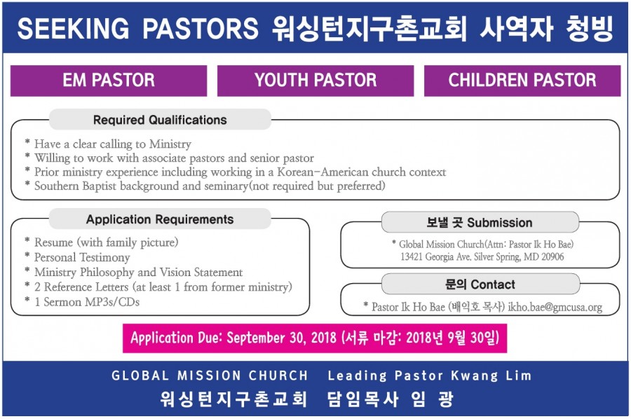 워싱턴 지구촌 교회에서 사역자를 청빙합니다