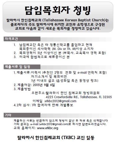 탈라하시 한인침례교회 (Tallahassee Korean Baptist Church)는 플로리다의 주도 탈라하시에 위치한 교민과 유학생으로 구성된 교회로 다음과 같이 새로운 담임목회자를 청빙하고 있습니다.