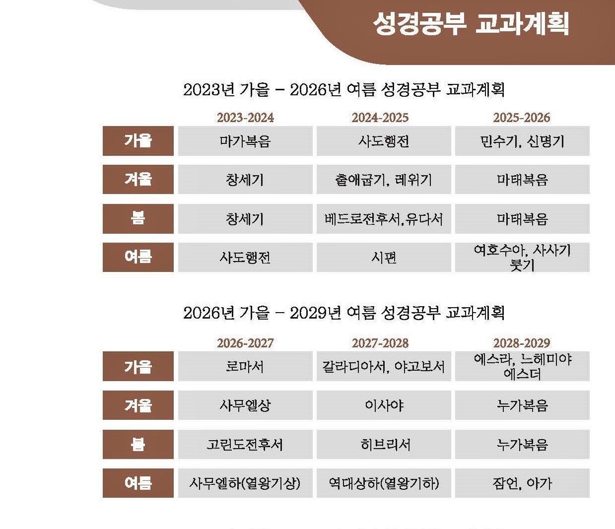 장년성경연구는 한 번에 한 권씩 성경을 공부할 수 있도록 디자인되어 있습니다. 성경을 연대순이나 주제별로 공부하는 것이 아니라, 매 학습 주기마다 성경 문학의 각 장르를 방문하면서 균형 잡힌 학습 경험을 제공하도록 설계되었습니다. 2023년 가을학기 (마가복음)부터 새로운 9년 사이클이 시작됩니다. 성경전체를 9년간 함께 공부할 수 있습니다. 청소년과 어린이들을 위한 성경연구 교재도 같은 본문으로 준비되어 있어 온 가족이, 그리고 온 교회가 함께 같은 말씀으로 성경을 공부하고 적용할 수 있도록 준비되어 있습니다.