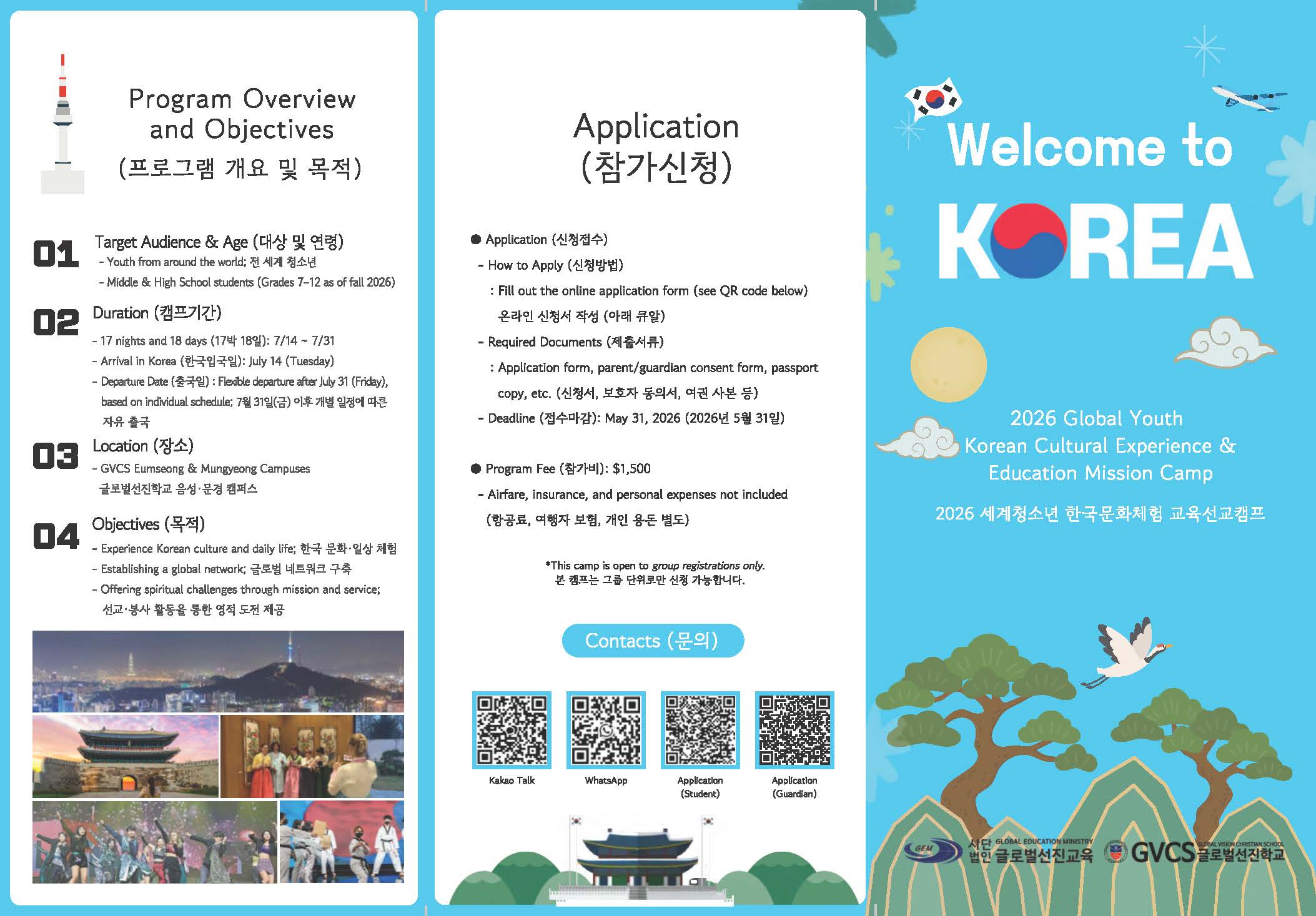 오는 2026년 7월, 전 세계 재외동포 청소년들을 초청하여 한국의 전통문화와 현대문화를 체험하고 글로벌 한민족 네트워크를 구축하며 영적 도전을 경험하는 ‘2026 세계청소년 한국문화체험 교육선교 캠프’를 개최합니다.