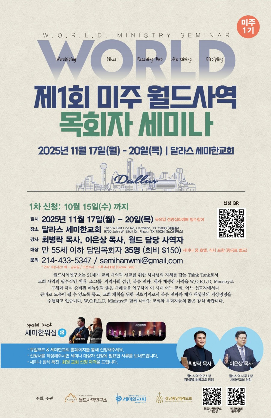 샬롬! 하나님의 은혜 가운데, 드디어 제1회 미주 월드사역 목회자 세미나가 미국 달라스 세미한교회에서 열리게 되었습니다.