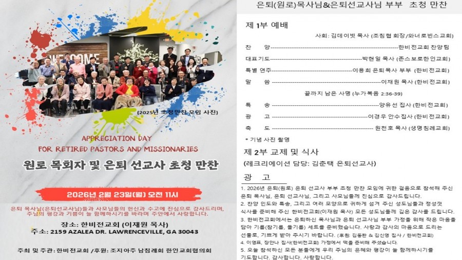 2026년 2월 23일(월) 오전 11시, 한비전교회(담임: 이재원 목사)에서 원로목사와 은퇴 목사, 은퇴 선교사 부부를 초청한 감사 만찬이 열렸다. 이번 행사는 조지아 남침례회 한인교회 협의회가 이어오던 뜻깊은 모임으로, 올해는 한비전교회가 지역의 은퇴 목회자들을 섬기고자 모든 순서와 음식, 선물까지 정성껏 준비하며 지역교회가 직접 섬김의 본을 보여주는 자리로 마련되었다.