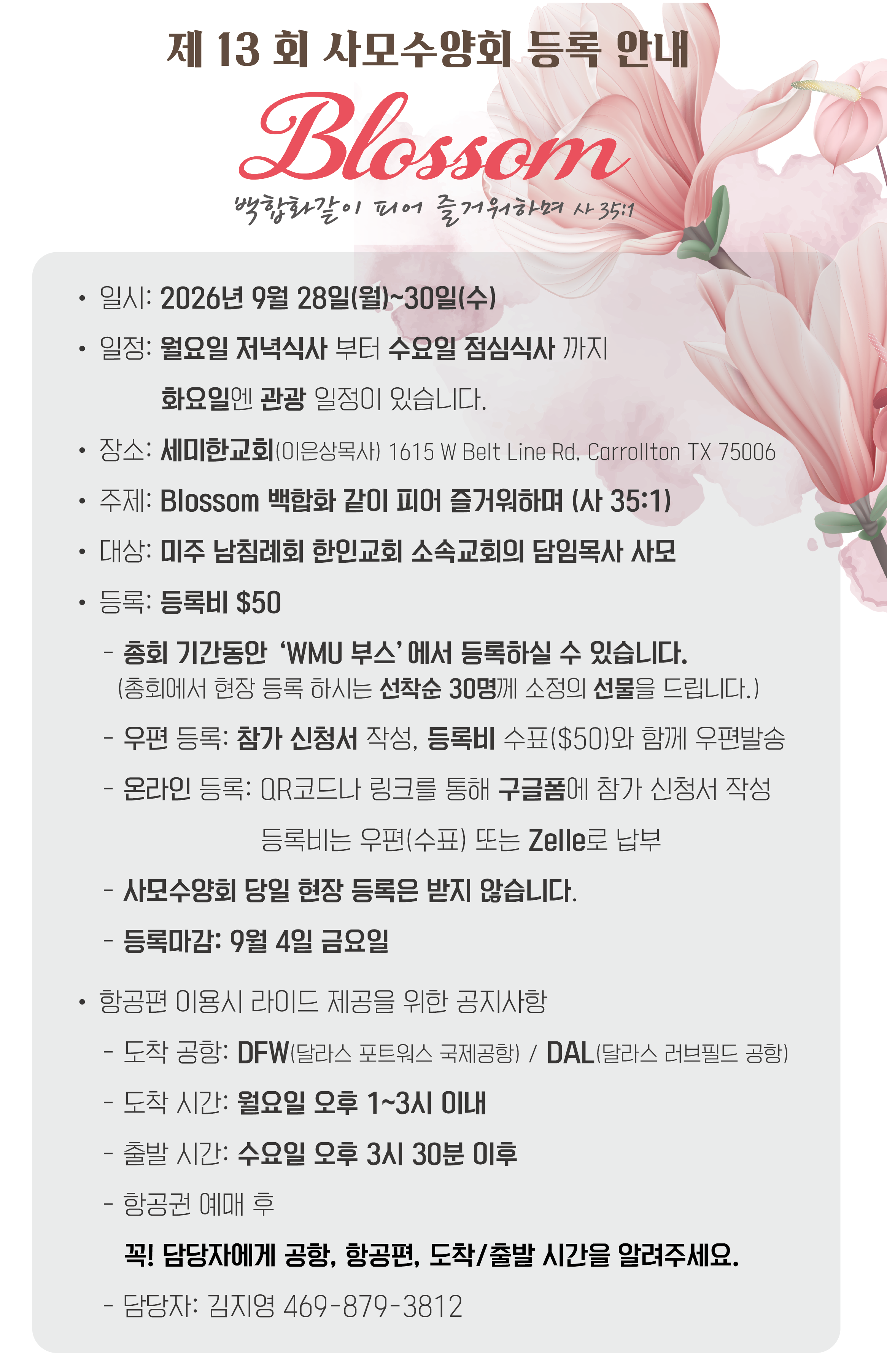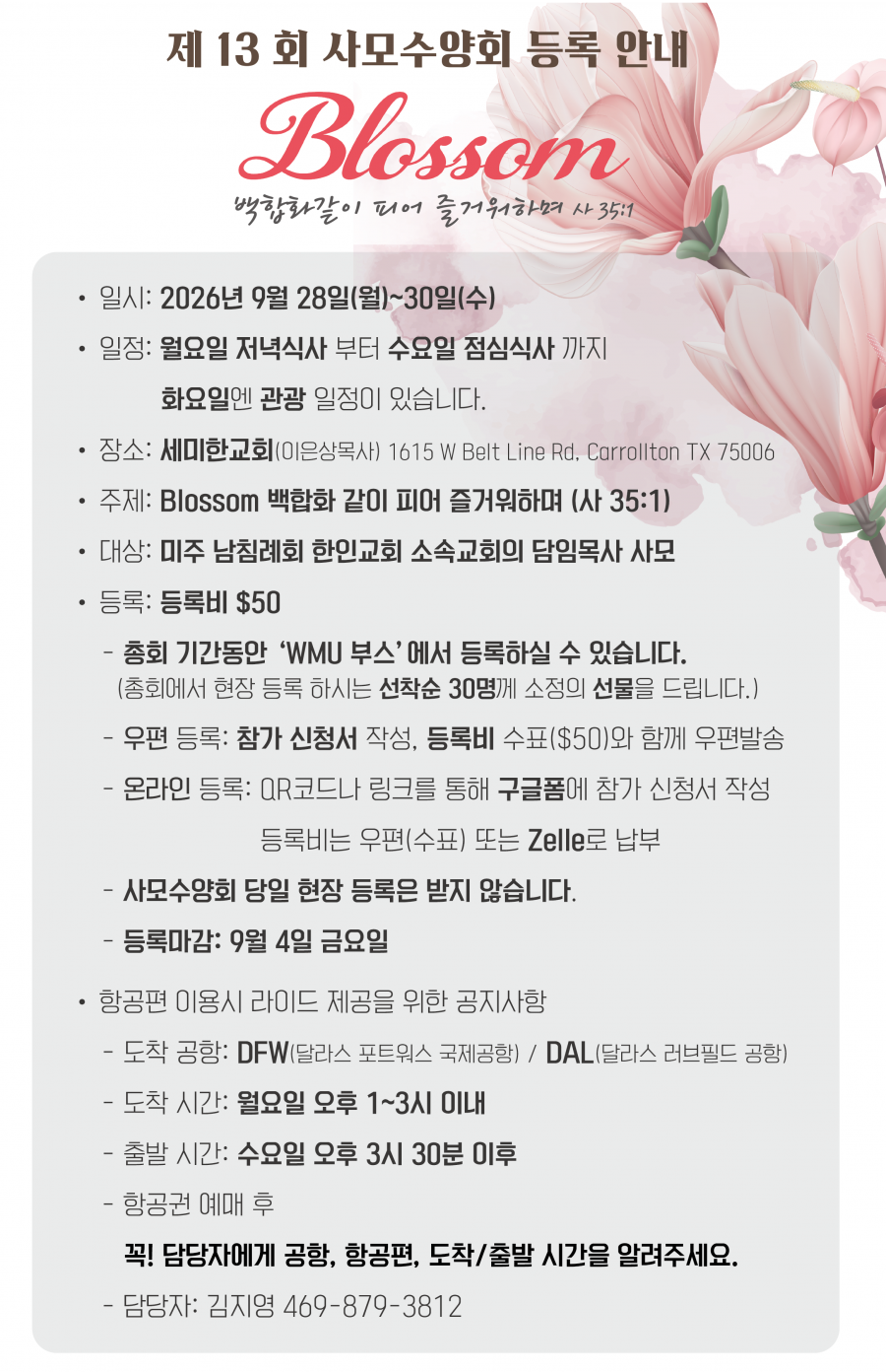 또한 등록비는 우편(수표)로 보내주셔도 되고 zelle로 납부하셔도 됩니다. (위의 내용 참고)