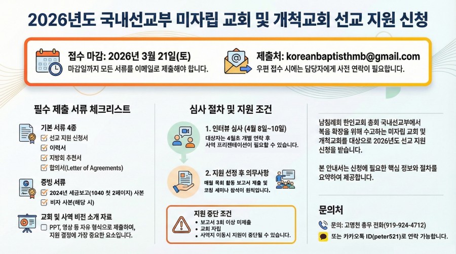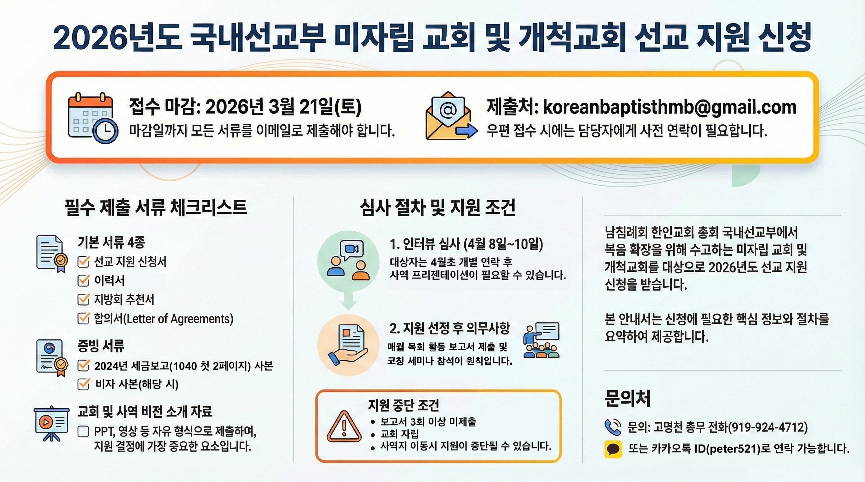 지원문의: 총무 고명천 목사 (koreanbaptisthmb@gmail.com, 919-924-4712)