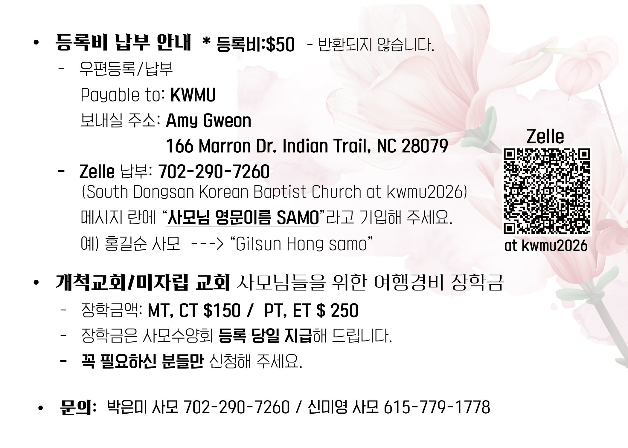 또한 등록비는 우편(수표)로 보내주셔도 되고 zelle로 납부하셔도 됩니다. (위의 내용 참고)